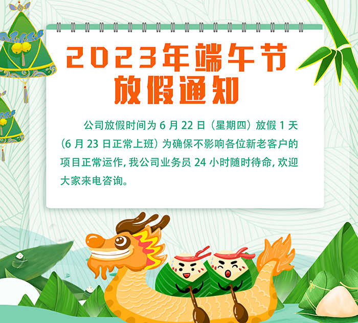 放假時間:6月22日(星期四)放假1天:(6月23日正常上班)為確保不影響各位新老客戶的項目正常運作,我公司業(yè)務(wù)員24小時隨時待命,歡迎大家來電咨詢,鑫華智能全體員工祝大家端午節(jié)安康。